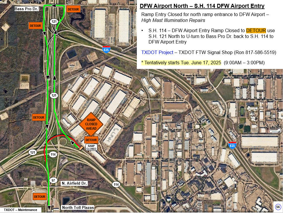TxDOT will be conducting illumination repairs that will require the closure of the westbound SH 114 ramp to southbound Spur 97 (an entrance ramp to DFW International Airport) on Tuesday, June 17, from 9 am to 3 pm. Please allow extra time during these hours if traveling to the airport. View a map of the upcoming closure.