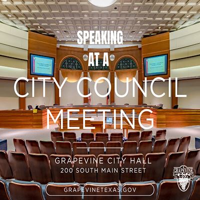 Guidelines for speaking at a Grapevine Council meeting may be viewed at https://www.grapevinetexas.gov/1799/Speaking-at-City-Council-Meetings. Council meetings are held at Grapevine City Hall, 200 South Main Street, on the first and third Tuesday of each month.